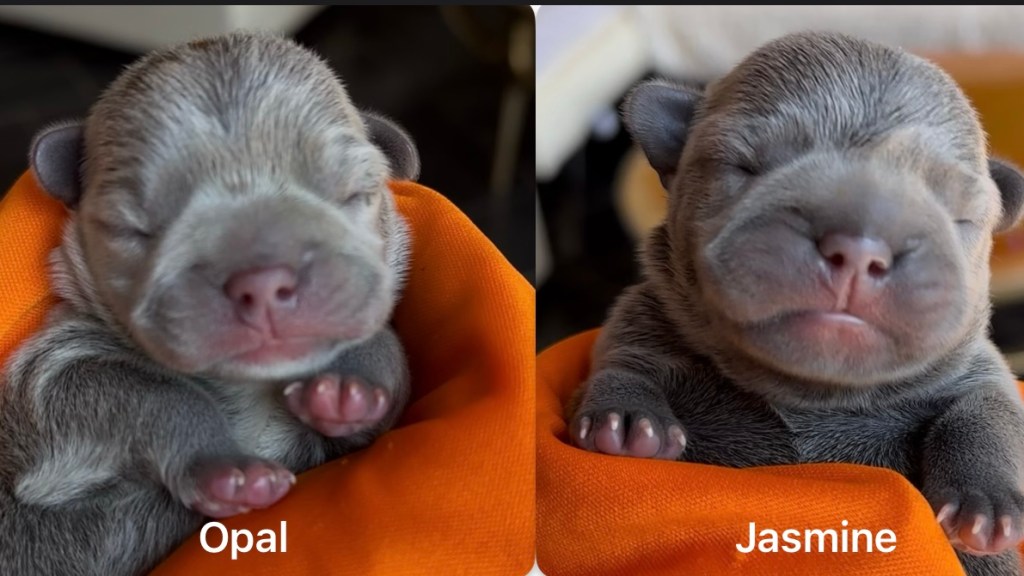 Cookie and Dozer’s fourth and final litter was born on July 27, 2024. It’s another beautiful litter of blue Frenchie puppies. Two beautiful baby girls.